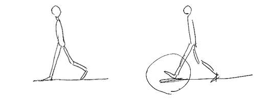 湖川 要するに、足開いた時に詰まってたんです。みんなが、そうやって動画をやってるんで、最初は僕もそうやってたんですが、理屈が合わないんですよ。自分で歩いてみたりなんかしてると。足の片方が曲がっていて、もう片方が真っ直ぐになる状態の時って、一番遅いんです。理屈で考えればそうなんです。それでその当時に直しました。トン、トン、トンという歩きですよね。それから、いまだにあるんですけど、走りの原画で着地のポーズの時に、足の先が上がっている原画があるんです。(スタジオ)ジブリのものは、全部と言うか、基本的なベースにしています。今でも、そういう原画を描く人がもの凄く多いです。僕の弟子はやらないですけど。