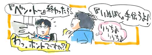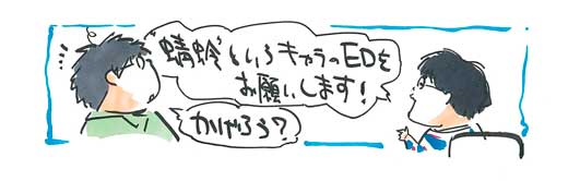 と考えるくらいなので、今回の『いぬぼく』EDもそれに則って作ってます。「枚数を使うよりも知恵を使う」で。そして、人件費削減のため(?)、久々に作画監督も自分でやりました。『キャプテン翼』第49話(2002年)、『この醜くも美しい世界』第7話(2004年)に続く数少ない作監作品になったって事です。……といってもキャラクターを整えて演出修正としてのっけたくらいですが。でも、最近になってやっとキャラや作監修正に興味が出てきたんで、近々また別作品でやろうと思います。 で、ザッと駆け足で解説が以下。