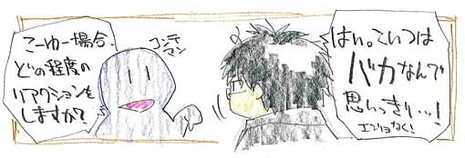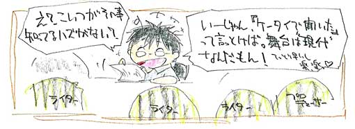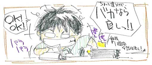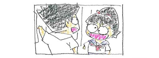こーなる前に……というか実制作に入る前に、監督がもう少し気を遣って“スタッフ全員が遊びやすい世界観・キャラ・映像”にしてあげれば、監督自身も全話全カットのレイアウトチェックなんて小さいところじゃなく、編集やアフレコ、ダビングとか……もっとスケールの大きなところにこだわれるハズ。自分は各話演出の時、上記のような監督君を何人も見、その都度その監督君らに冷ややかな視線を送り続けてきました。じゃ、板垣が提唱するスタッフ全員がイメージを共有できる(比較的共有しやすい)設定――つまり“現代・バカ・フラット……”だったら、監督の仕事はこーなります。