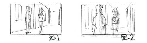 図1を見てください。板垣はコンテチェックの際(自らきったコンテはなおの事)可能な限り図1のような画を潰して図2の画にします。図2の場合、足もとをフレームから切ってるため、最悪にパースが狂ってるレイアウトが上がってきたとして、さらに最悪な事にレイアウトを直す時間がなかったとしても、キャラをズラしたり背景をボカしたりすりゃなんとかなります。ところが図1で失敗するとどーやっても立ち直れません。いや、たとえ図1の絵が欲しくっても、図2にする事で作画がしやすく(キャラに芝居がさせやすく)なったり背景が楽できたりするなら、図2にするのが自分のやり方です。少なくともTVシリーズはっ! はい、“お前ぇーの演出はユルい!”と言うなら好きなだけ言ってください。俺、図1にこだわって監督の机の上をレイアウトの山にするくらいなら、図2のコンテでレイアウトをし、監督チェックスルーして作画に時間を与えて、アフレコ時に少しでもよい状態で役者さんたちに芝居をしてもらった方が絶対よいフィルムになるという確信してますから!