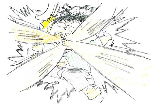ノノがつかまったマシン兵器の腕をザックリ! から女店主(?)がタバコのケムリを吐くまで(確か、芳垣様と林様の間)。「ヤッベー、俺凄ぇ似ちゃったよ貞本キャラに!」と大喜びしてレイアウトを提出したら、貞本(義行)様より“こりゃカトゥーンだ!”というメッセージとともにキャラ修いっぱいのってて、自分の描いたノノが全然似てなかった事に初めて気づきました。ホント、貞本さんの修正よかったです!